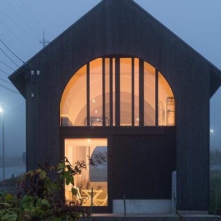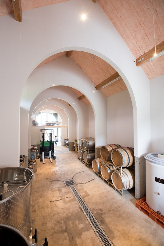 The winery was half-grounded to level the slope, which has a height difference of 2 metres. The semi-underground allows for gentle temperature control, as the temperature difference inside is now only plus or minus 2 to 3 degrees Celsius during the day, even when the outside air temperature is very cold.