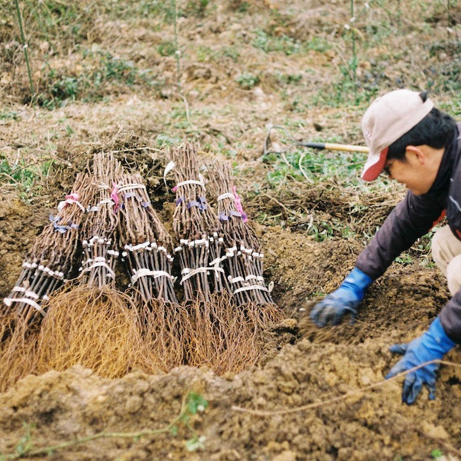 In order to improve the quality of the grapes and to pursue the terroir of Nara, he practices organic viticulture in his own vineyards. No herbicides or chemical fertilisers are used, and only Bordeaux mixture and sulphur-based spray are used as a minimum.