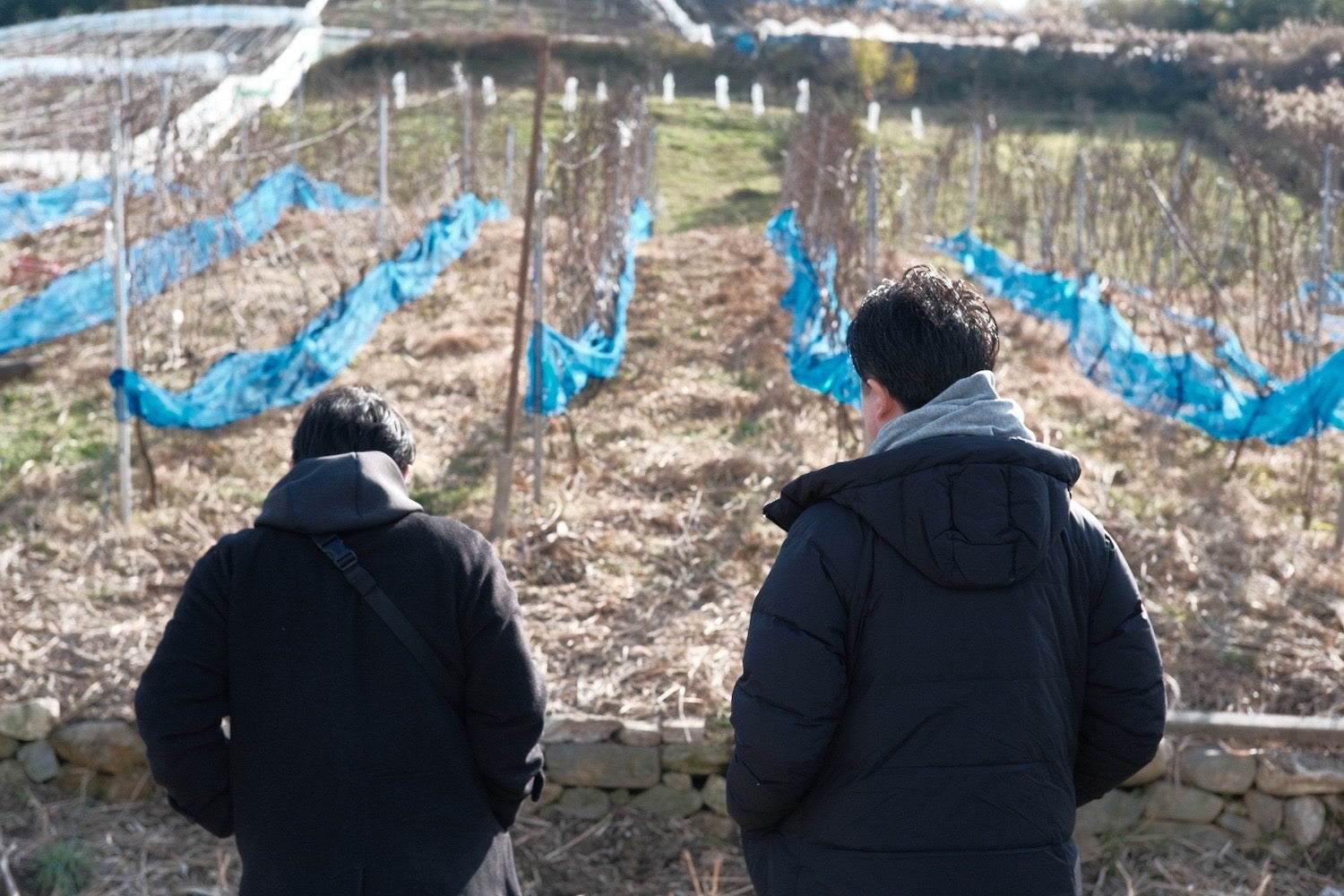 After becoming independent, he rented three vineyards and started growing grapes. One was an abandoned plot of land of about 40a in Tenri, Nara. The other two were rented in Osaka: a 13a vineyard in Habikino and a 4a vineyard in Kashiwara.