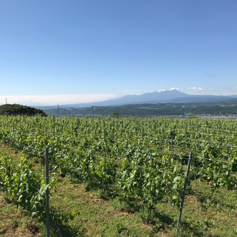 The vineyard used to be a field with decayed grape trellises, but after clearing the bushes and removing the trellises and posts with heavy machinery, it is a very pleasant place to farm, with a spectacular view of the distant Japanese Alps.